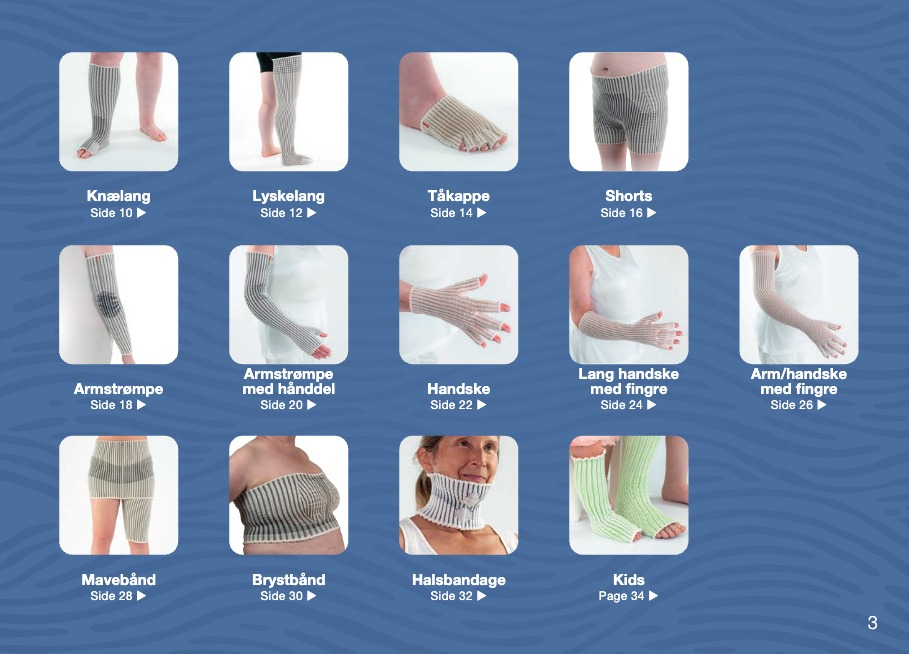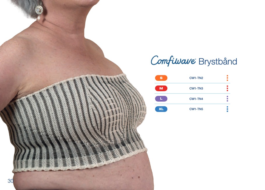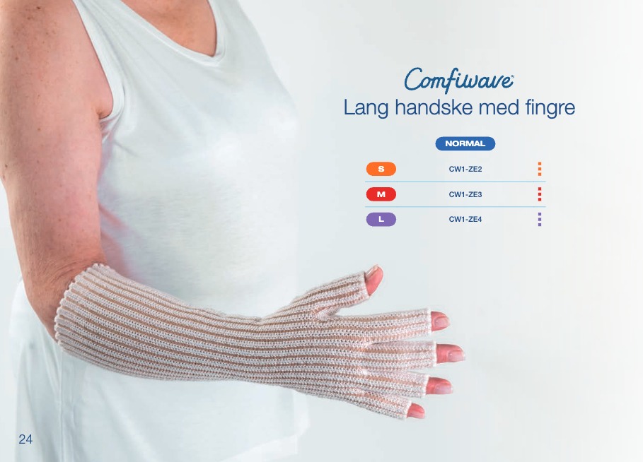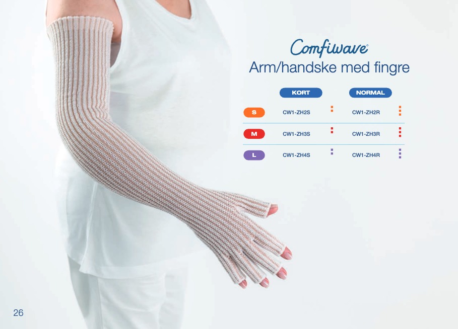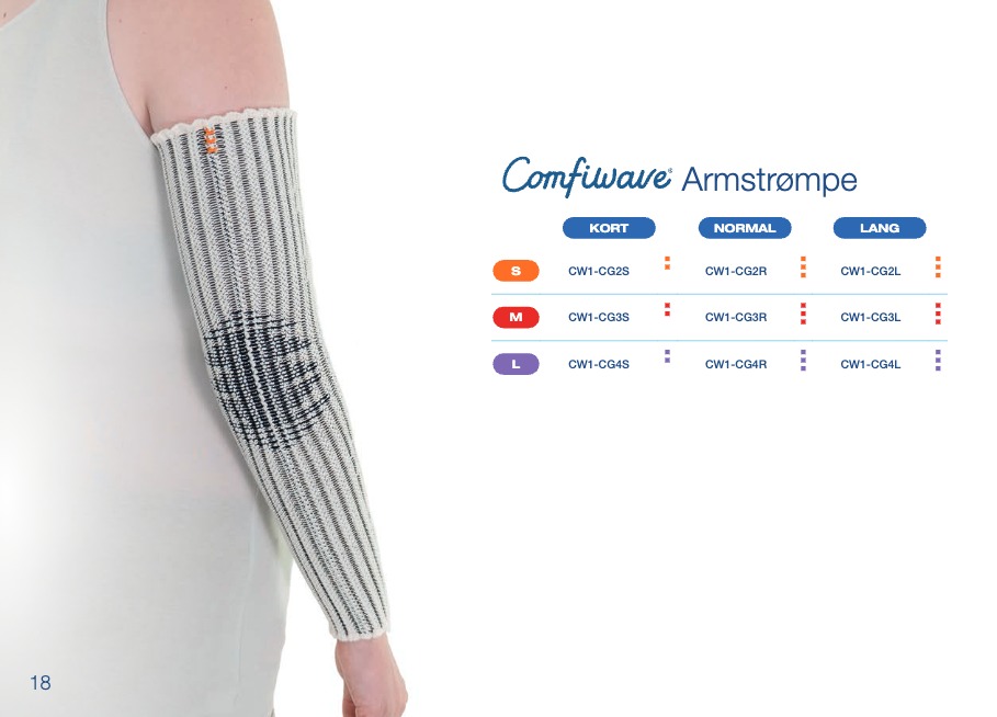 Comfiwave er lavet af 100% blød, ufarvet bomuld på indersiden og strikket i bæk og bølge facon, som gør den åndbar. Anvendte materialer er: Bomuld 82%, polyurethan 10% og polyester 8%. Måden Comfiwave er strikket på samt selve materialet gør, at den let kan syes i og ændres på, så den kan yderligere tilpasses i vores systue ved helt specifikke problemstillinger. Det er altid i tæt samarbejde med lymfødemterapeuterne, vores kompressionssygeplejersker og syerske.