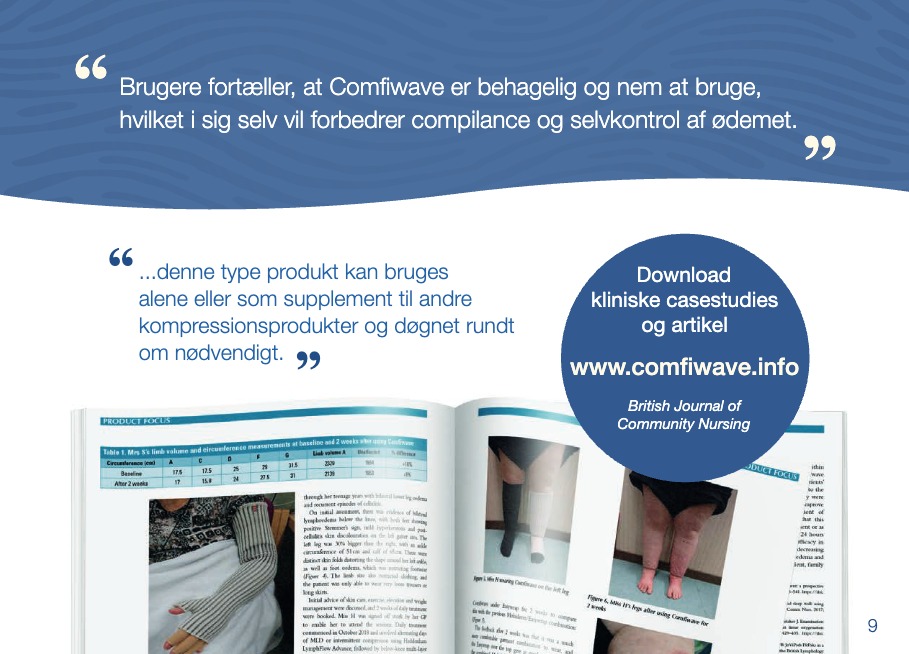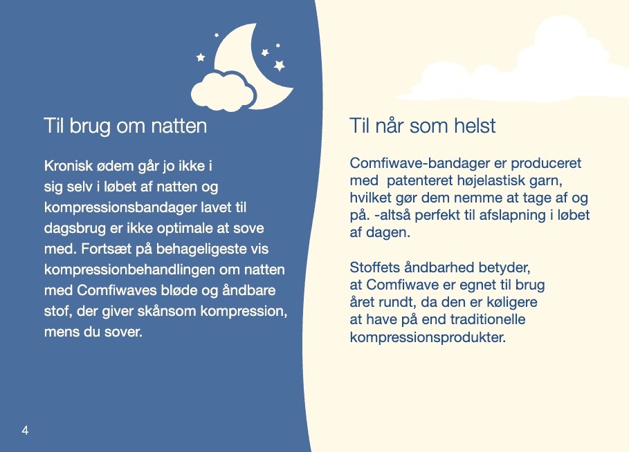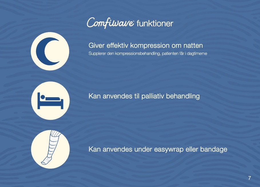 Comfiwave er først og fremmest en nat/hvilebandage, beregnet som et supplement til den almindelige daglige brug af lymfødemstrømper/kompressionsstrømper og det er vigtigt at påpege, at bandagen ikke behandler eller fjerner lymfødem, men afhjælper de daglige gener, som kan opstå hos en del af denne type patienter.