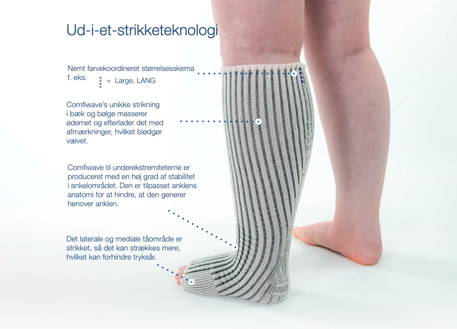 Efter at have brugt Comfiwave natten over, efterlades der fordybninger/bølgemønster i vævet, som er blødgjort, således at proteiner og overskudsvæske lettere kan flyttes ved almindelig daglig brug af kompressionsstrømper.