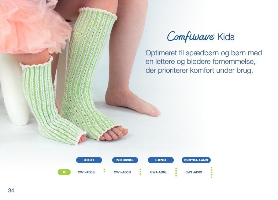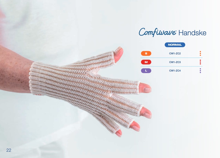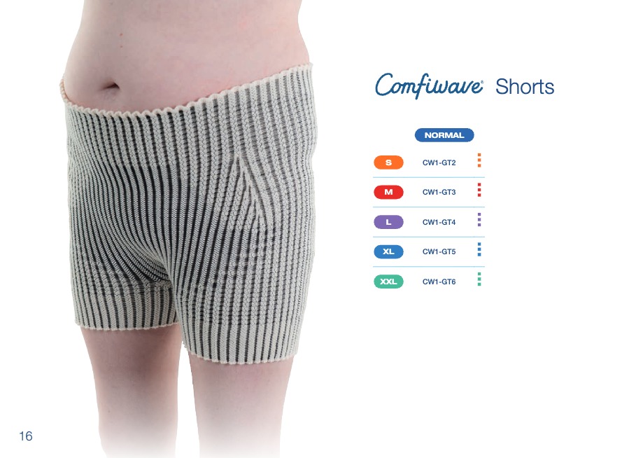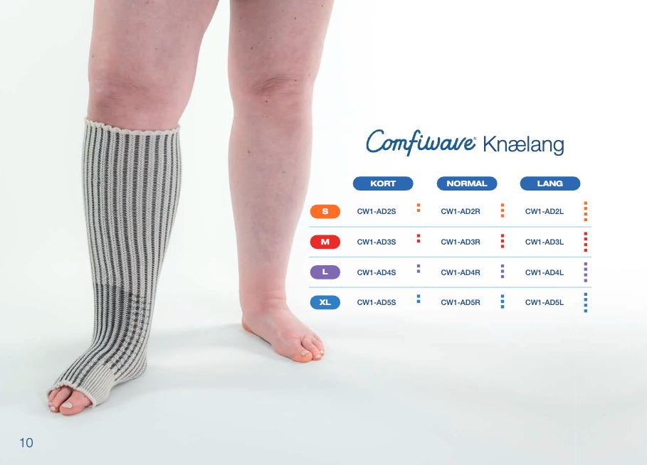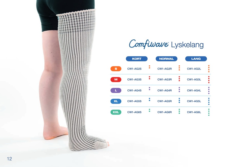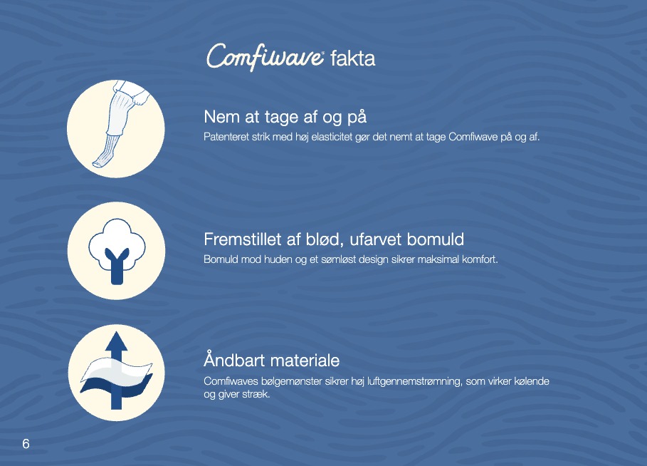 Comfiwave er produceret med patenteret højelastisk garn, hvilket gør den nemmere at tage af og på og stoffets åndbarhed betyder, at den er køligere at have på end traditionelle kompressionsprodukter
